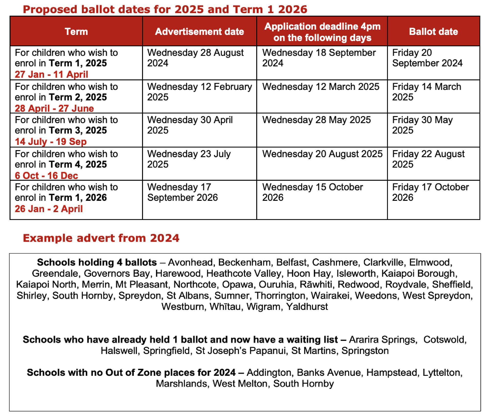 Schools wanting to advertise a single ballot date for 2025 – Usually, schools advertise a ballot date for each term of the year. However, a few just advertise a single ballot date for the whole year and then create a waiting list. This ballot will be included in the Term 1, 2025 advert. We will continue to include schools who have held one ballot in the advertising every term, so families are aware